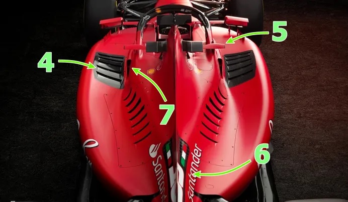 A ambos lados del colector de aire superior siguen siendo muy visibles las dos aletas verticales (5) en forma de cuernos. Ferrari ha mantenido un capó muy esbelto y pequeño, un camino diferente en comparación con el resto de escuderías. Dichos aletines se han mantenido sin pintar con el color negro de la fibra de carbono, para ahorrar peso.