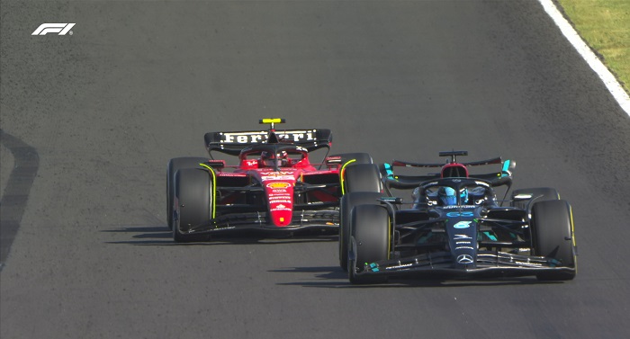 Por detrás, Carlos Sainz hizo una espectacular salida gracias a los blandos, para colocarse justo detrás de Charles Leclerc, sexto, mientras Fernando Alonso se situaba situado séptimo, con Sergio Pérez detrás. Guanyu Zhou, quedaba casi parado en la parrilla, y además de perder muchas plazas, en su intento de recuperar posiciones tocó a Daniel Ricciardo en la frenada de la primera curva, y este a su vez envistió por detrás a los dos Alpine en carambola.