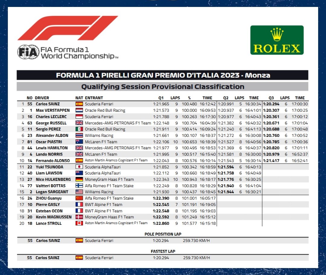 Cuarta Pole Position de Carlos Sainz de su carrera deportiva y cuarta vestido de rojo, y tercera de la Scuderia de la temporada 2023. Para Ferrari es la 245 pole de su historia desde que compite en la Fórmula 1