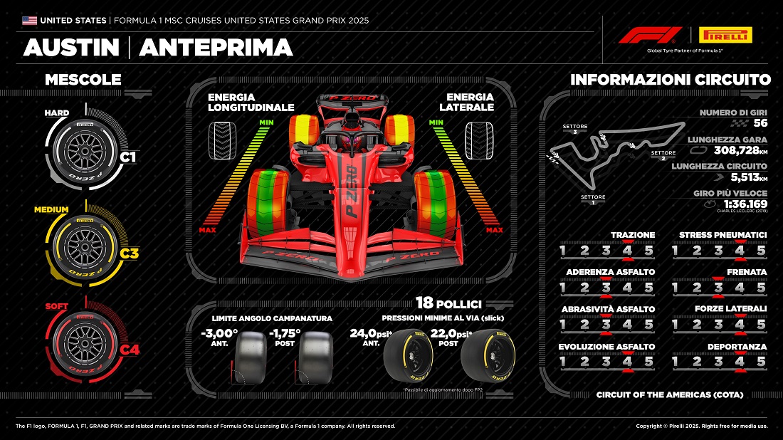 Por lo que respecta a los neumáticos, el COTA será el segundo circuito donde Pirelli utilizará tres compuestos no consecutivos. Tras Spa-Francorchamps, se volverá a utilizar esta combinación. De este modo, el C1, que irá pintado de blanco actuará como el neumático duro, el C3, que irá de amarillo será el medio, y el C4, que irá marcado de rojo actuará como el neumático blando.