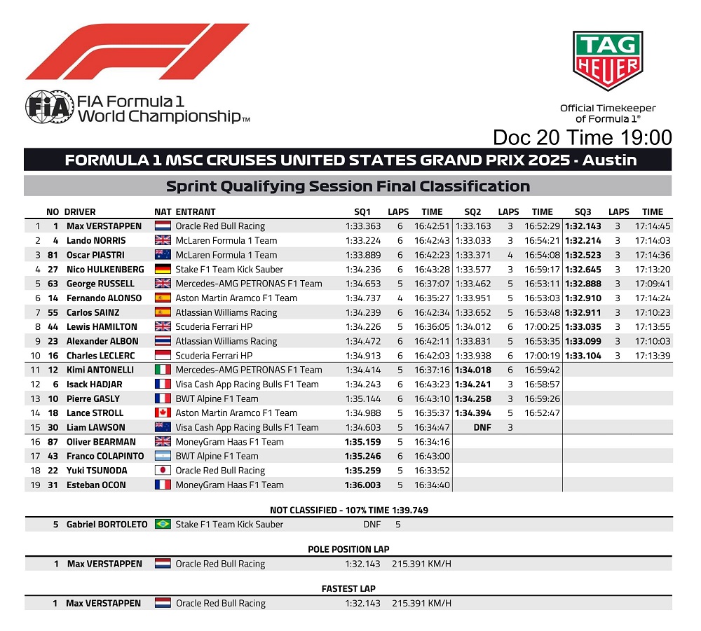 El cuarto fin de semana al Sprint de la temporada, daba una nueva variable al último cuarto del campeonato 2025 de Fórmula 1. Max Verstappen se llevó la pole Sprint en el Circuito de las Américas y tomará la carrera corta al frente como invitado de honor del Mundial. Lando Norris y Oscar Piastri partirán segundo y tercero y mantendrán su lucha en el removido seno de McLaren, equipo campeón pero ya no dominador, como en la primera mitad del año. Y de Ferrari, solo decir que está en caída libre en estos momentos, con problemas en la caja de cambios en el coche de Leclerc y con un Hamilton que hace lo que puede con lo que tiene.