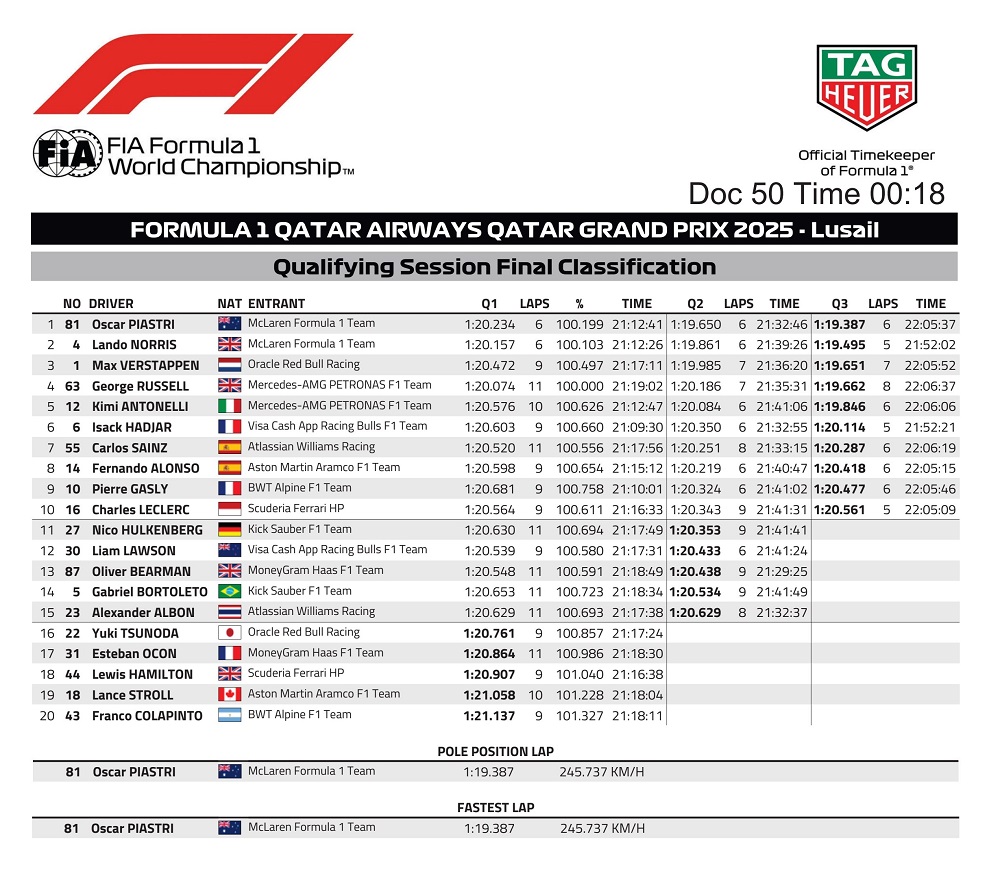 Quedaban cinco minutos de sesión cuando la bandera roja se retiraba y nadie saldría con prisas. Norris en su vuelta se fue largo en la segunda curva y perdió su oportunidad, abortando la vuelta. Piastri aprovechó la oportunidad y le quitó la pole a su compañero por una décima (1’19’’387), seguidos a dos décimas y media por Verstappen y Russell (11 milésimas del neerlandés respecto al Mercedes). Andrea Kimi Antonelli y Hadjar formarán la tercera fila, rellenando el comprimido top 10 Sainz, Alonso, Gasly y Leclerc.