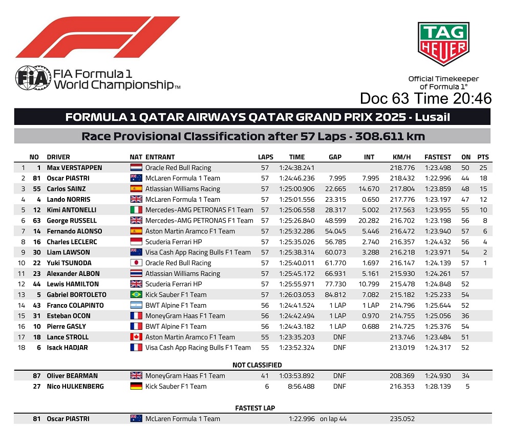 Piastri debía recortar un segundo por vuelta a Verstappen y Max le mantuvo a raya a medio segundo por giro en otro Gran Premio imperial del Red Bull. Sainz era tercero pero se quejó de subviraje en las curvas a derecha, informándole el equipo de daños en el fondo plano. Antonelli y Norris se acercaron al Williams en las últimas cinco vueltas y generaban cierta tensión que el español apaciguó cuando encontró un par de décimas que le permitieron respirar.