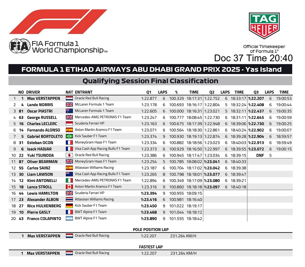 Tras ellos se clasificaban George Russell cuarto, y Charles Leclerc quinto. Lewis Hamilton, cayó en la Q1 por tercera carrera consecutiva en un fin de año para olvidar, y saldrá mañana en carrera desde la decimosexta posición.