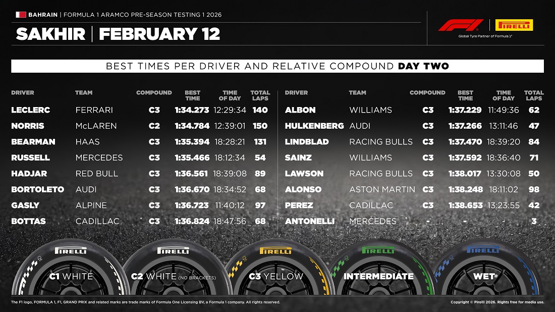 Las condiciones ambientales y de la pista fueron muy similares a las del primer día, con temperaturas en la pista que oscilaron entre 25 °C y 42 °C, y temperaturas del aire entre 24 °C y 32 °C. Las pruebas se reanudarán mañana a las 10:00h hora local y finalizarán a las 19:00h, esta vez con Lewis Hamilton al volante del SF-26.