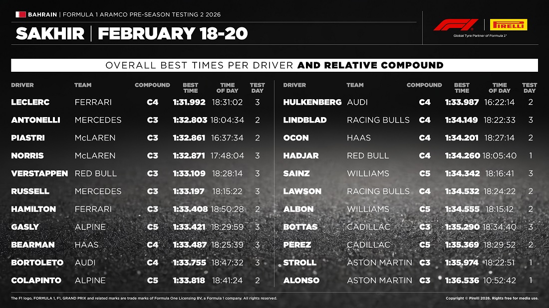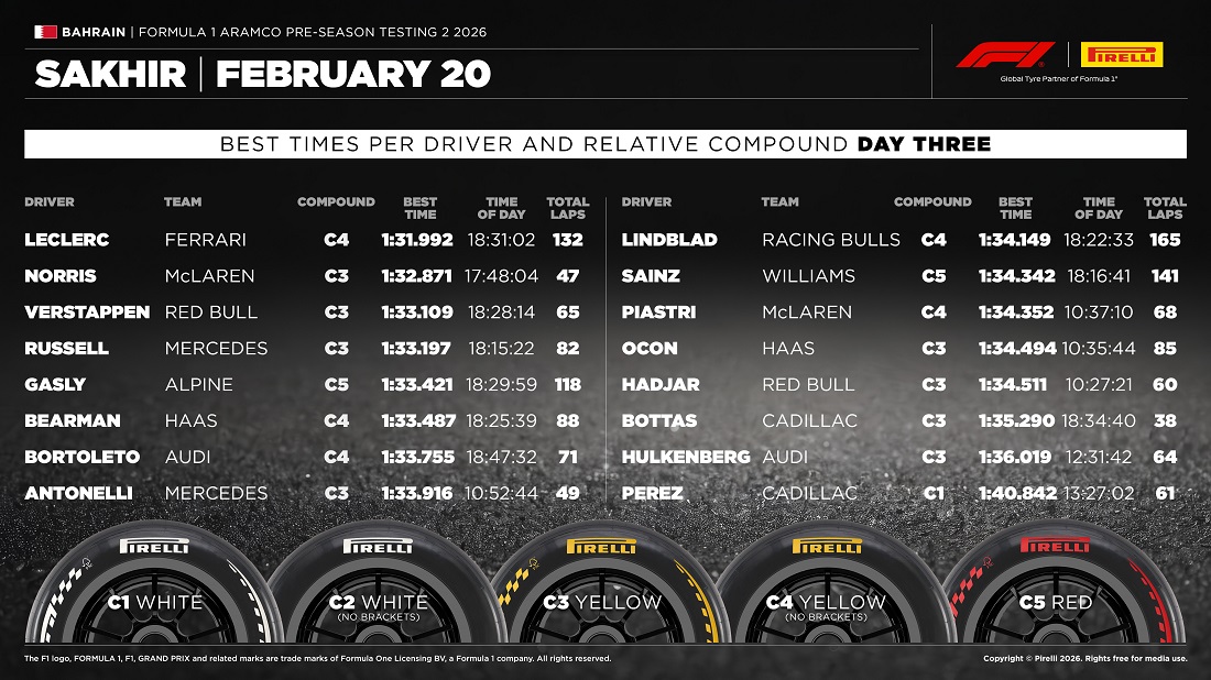 La pretemporada en Bahréin ha llegado a su fin este viernes, y Charles Leclerc ha firmado el mejor crono de la jornada y de la pretemporada, con un 1’31’’992. Los Ferrari se han mostrado sólidos y consistentes a lo largo de estas dos semanas de test, pero sobre todo en esta jornada final. George Russell ha podido rodar rápido durante la tarde tras el problema que dejó parado al Mercedes de Andrea Kimi Antonelli durante la mañana.