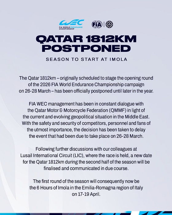 ”Como evento inaugural del Campeonato Mundial de Resistencia de la FIA, los 1812 km de Qatar ocupan un lugar especial para muchos seguidores, pilotos y equipos por igual, y trabajaremos en estrecha colaboración con todos los involucrados para reprogramar la carrera para más adelante en la temporada 2026. La FIA continúa monitorizando los acontecimientos en la región y nuestros pensamientos están con todos los afectados por estos recientes eventos mientras esperamos que haya calma, seguridad y un retorno a la estabilidad”, ha declarado el Presidente de la FIA, Mohammed Ben Sulayem.