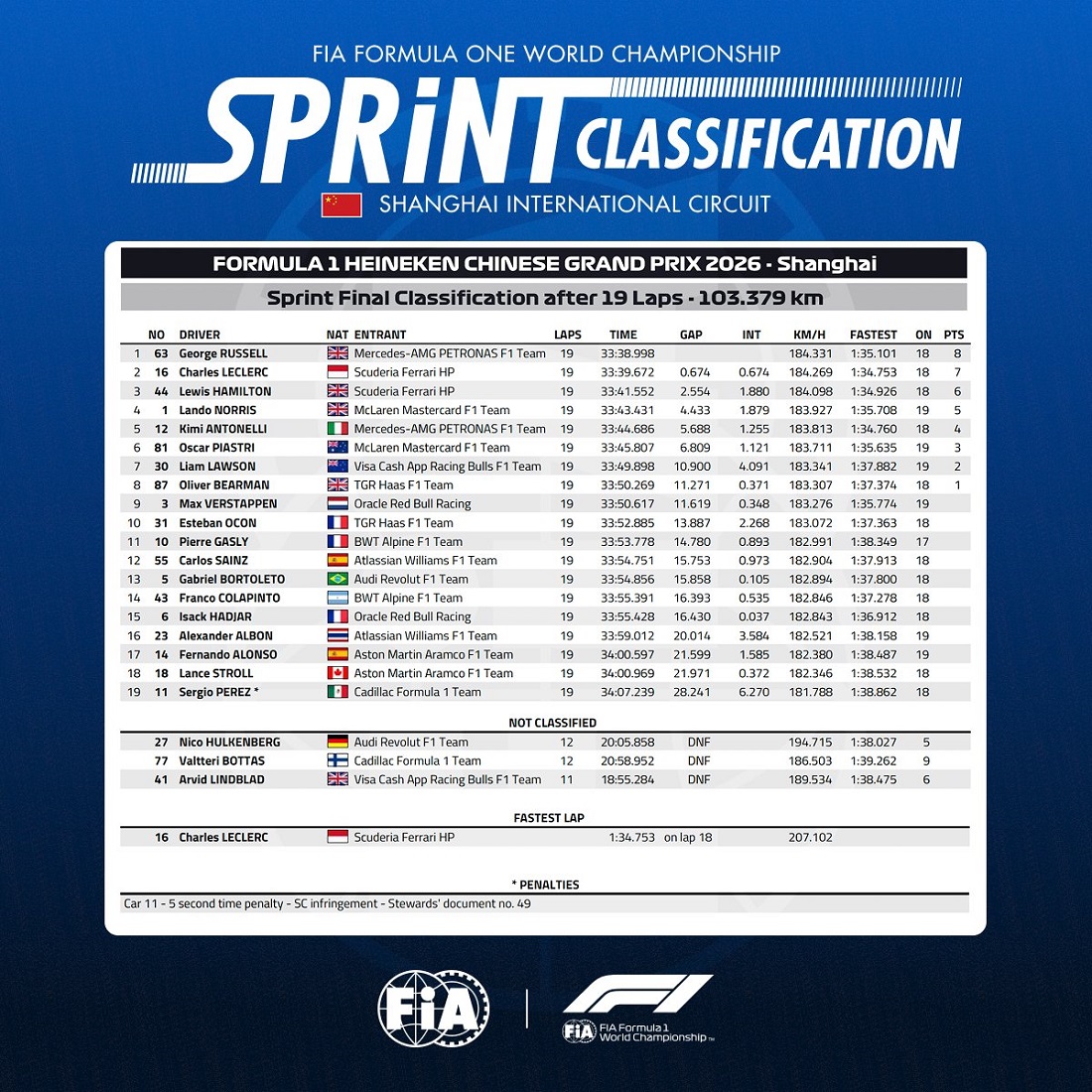 Lando Norris ha finalizado cuarto y Kimi Antonelli ha podido remontar hasta el quinto lugar, con Oscar Piastri también remontando hasta el sexto. Liam Lawson y Oliver Bearman han completado las posiciones de puntos, dejando fuera a un Max Verstappen que hoy ha estado errático, desde quedarse clavado de nuevo en la salida hasta cometer algún error en forma de pasada de frenada.