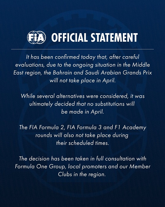 La Fórmula 1 se ha tomado su tiempo para evaluar la situación del conflicto bélico en Oriente Medio, sin embargo, no parecía tener mucho sentido alargar la espera hasta la próxima semana. El Campeonato del Mundo ha confirmado este mismo fin de semana su decisión de suspender los Grandes Premios que estaban previstos disputarse el próximo mes de abril en Bahréin y Arabia Saudí, dejando de esta forma el calendario en apenas 22 fines de semana competitivos ya que no serán reemplazadas dichas carreras ni aplazadas a una nueva fecha.