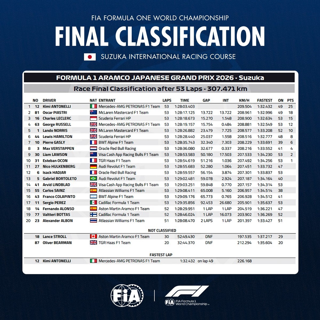Kimi Antonelli lograba su segunda victoria consecutiva en la Fórmula 1, en el GP de Japón de este domingo. El italiano de Mercedes ha aprovechado un coche de seguridad en el momento más oportuno para escalar al liderato y no soltarlo hasta la bandera a cuadros, venciendo con autoridad para tomar el liderato del Mundial de Pilotos frente a su compañero, George Russell.