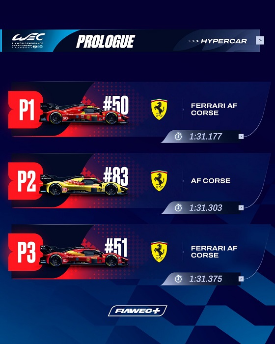 Los tres Ferrari 499P de AF Corse aprovecharon las ocho horas del Prólogo, divididas en dos sesiones, para familiarizarse, especialmente con los nuevos neumáticos Michelin para lluvia. En ambas sesiones, los coches del Cavallino Rampante terminaron entre los tres primeros puestos de los 17 Hypercars inscritos en la categoría reina del Campeonato Mundial de Resistencia.
