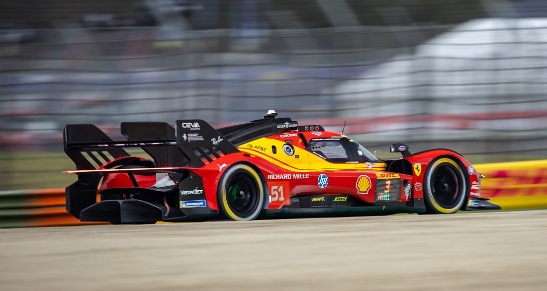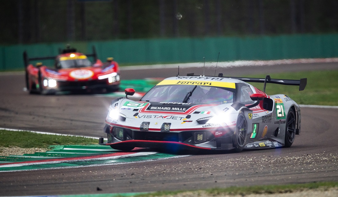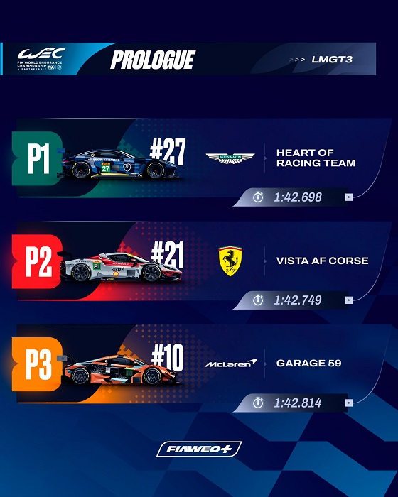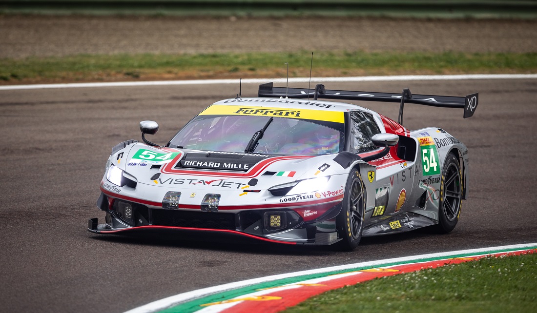 Por lo que respecta a la clase LMGT3, los dos Ferrari 296 GT3 Evo inscritos por Vista AF Corse, con las mismas tripulaciones que el año pasado, completaron la sesión de pruebas de ocho horas, familiarizándose con las cambiantes condiciones de la pista, que incluyeron el uso de neumáticos Good Year de lluvia. El coche #21 completó un total de 146 vueltas, mientras que el #54 completó 126.